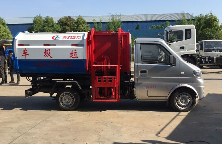 東風小康3方掛桶垃圾車東風小康3方自裝卸式垃圾車有效裝載容積3立方,箱體采用邊三底四碳鋼板制作,箱體前部側面帶有掛桶提升機構,可自動舉升垃圾桶倒入垃圾,帶自卸功能,尾部裝有橡膠密封條,防污水滴漏,掛桶垃圾車可根據客戶要求搭配120升或240升塑料桶和鐵桶。