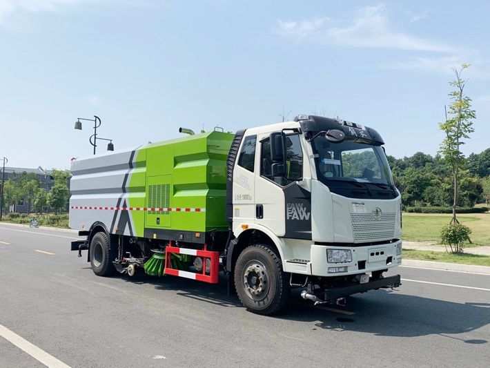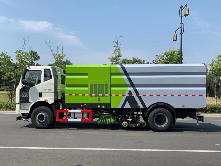 帶2個中置掃盤;中置超寬吸嘴;雙層吸塵筒; 康明斯170馬力副發動機;臺灣液壓閥;大力馬達;德國高壓水泵 (前沖/側噴/中噴/后噴霧)/側沖洗水槍/垃圾箱自潔裝置); 萬向高壓路沿清洗;威龍低壓泵(前沖),氣動球閥控制; 4mm不銹鋼垃圾箱;不銹鋼水箱;德國控制器;尾部箭頭燈; 機油、垃圾箱、水箱均帶防溢或低位報警裝置;倒車及洗掃狀態室內監視器; 多種語音提示;倒車自動保護、防傾倒垃圾翻車保護、檢修安全保護; 20m高壓沖洗卷盤;刷臂轉動機構使用德國進口高新耐磨工程隔套,免打黃油; 冷彎無縫液壓油管;運動控制器一鍵電腦控制。洗掃寬度3.5m;吸入粒度p110mm。 湖北程力國六解放洗掃車多方位圖片: